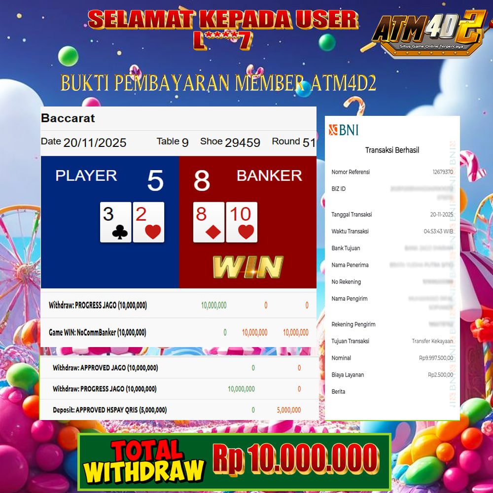 ATM4D2 dikenal sebagai situs terpercaya yang selalu menghadirkan pengalaman bermain slot online yang aman, fair, dan berlisensi resmi. Di sini, kami tidak hanya sekadar memberikan janji, tapi bukti nyata berupa slip kemenangan yang dapat Anda lihat secara langsung.