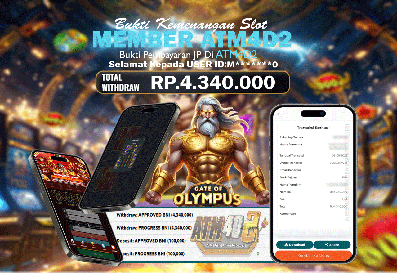 ATM4D2 dikenal sebagai situs terpercaya yang selalu menghadirkan pengalaman bermain slot online yang aman, fair, dan berlisensi resmi. Di sini, kami tidak hanya sekadar memberikan janji, tapi bukti nyata berupa slip kemenangan yang dapat Anda lihat secara langsung.
