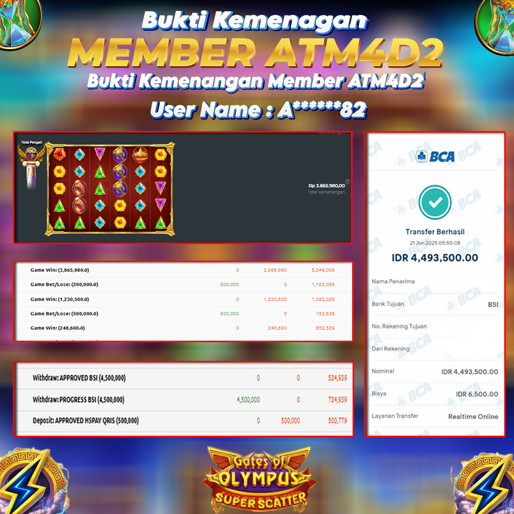 ATM4D2 dikenal sebagai situs terpercaya yang selalu menghadirkan pengalaman bermain slot online yang aman, fair, dan berlisensi resmi. Di sini, kami tidak hanya sekadar memberikan janji, tapi bukti nyata berupa slip kemenangan yang dapat Anda lihat secara langsung.