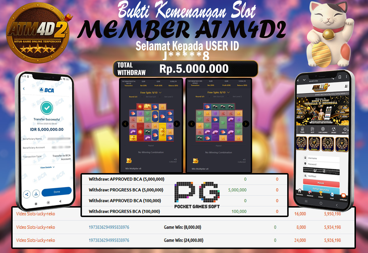 ATM4D2 dikenal sebagai situs terpercaya yang selalu menghadirkan pengalaman bermain slot online yang aman, fair, dan berlisensi resmi. Di sini, kami tidak hanya sekadar memberikan janji, tapi bukti nyata berupa slip kemenangan yang dapat Anda lihat secara langsung.