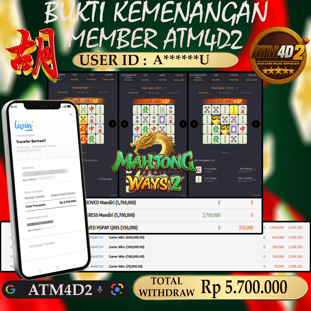 ATM4D2 dikenal sebagai situs terpercaya yang selalu menghadirkan pengalaman bermain slot online yang aman, fair, dan berlisensi resmi. Di sini, kami tidak hanya sekadar memberikan janji, tapi bukti nyata berupa slip kemenangan yang dapat Anda lihat secara langsung.