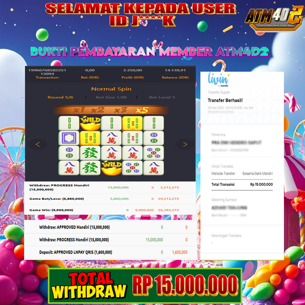 ATM4D2 dikenal sebagai situs terpercaya yang selalu menghadirkan pengalaman bermain slot online yang aman, fair, dan berlisensi resmi. Di sini, kami tidak hanya sekadar memberikan janji, tapi bukti nyata berupa slip kemenangan yang dapat Anda lihat secara langsung.