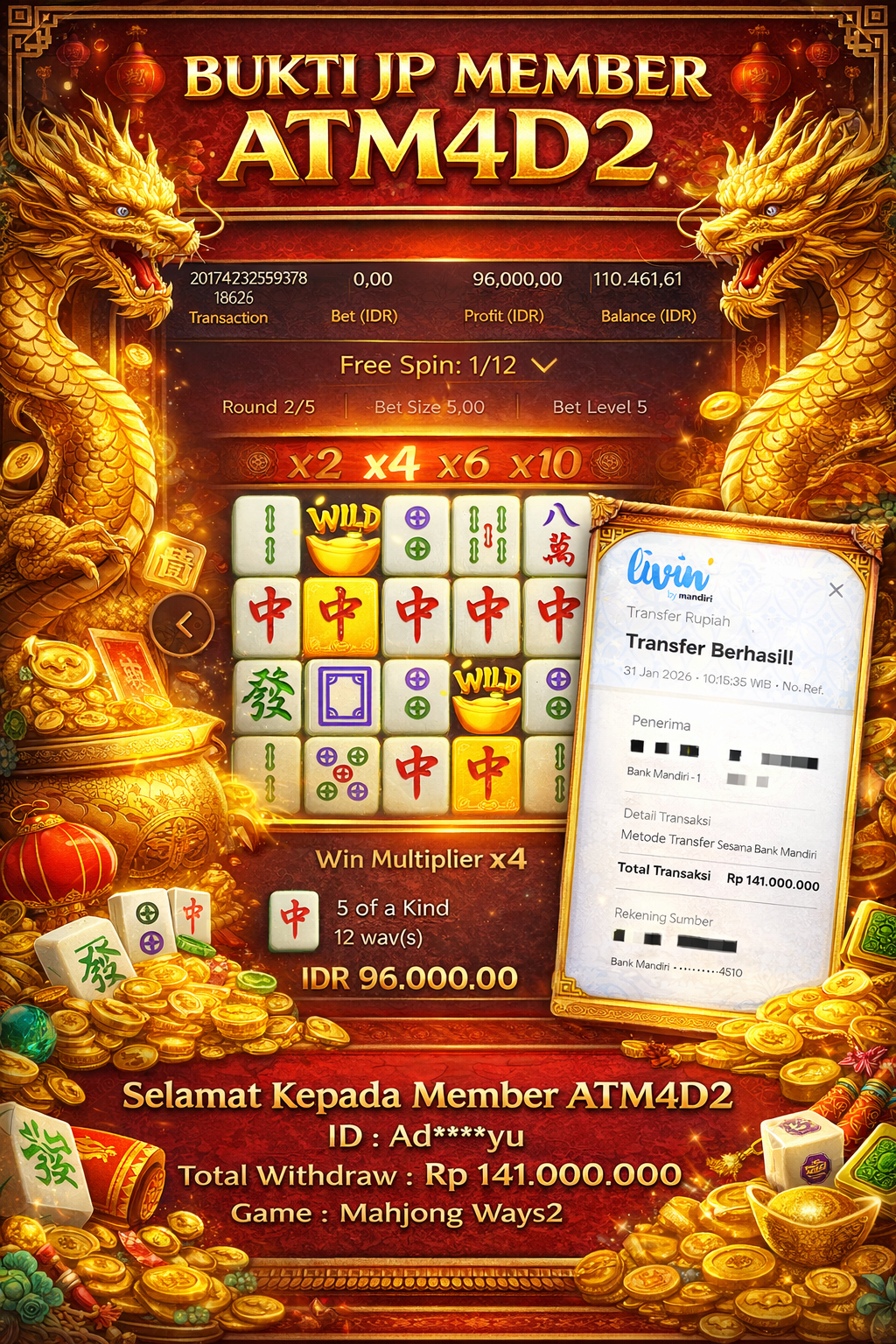 ATM4D2 dikenal sebagai situs terpercaya yang selalu menghadirkan pengalaman bermain slot online yang aman, fair, dan berlisensi resmi. Di sini, kami tidak hanya sekadar memberikan janji, tapi bukti nyata berupa slip kemenangan yang dapat Anda lihat secara langsung.