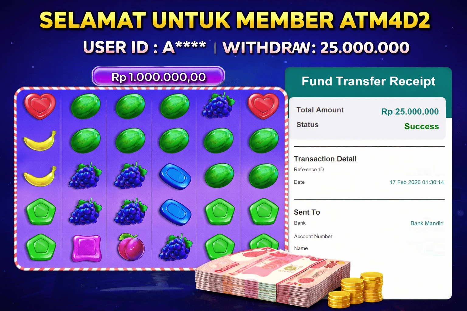 ATM4D2 dikenal sebagai situs terpercaya yang selalu menghadirkan pengalaman bermain slot online yang aman, fair, dan berlisensi resmi. Di sini, kami tidak hanya sekadar memberikan janji, tapi bukti nyata berupa slip kemenangan yang dapat Anda lihat secara langsung.
