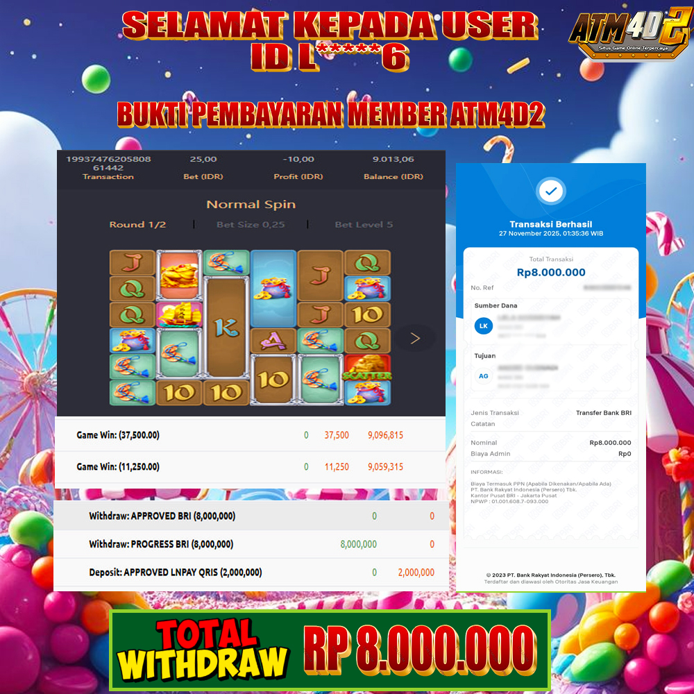 ATM4D2 dikenal sebagai situs terpercaya yang selalu menghadirkan pengalaman bermain slot online yang aman, fair, dan berlisensi resmi. Di sini, kami tidak hanya sekadar memberikan janji, tapi bukti nyata berupa slip kemenangan yang dapat Anda lihat secara langsung.
