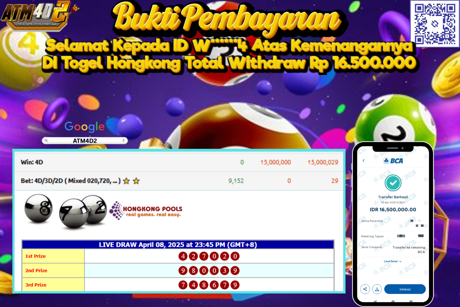 Setiap hari, member ATM4D2 berhasil meraih jackpot besar dari berbagai provider slot ternama yang kami sediakan, seperti Pragmatic Play, Habanero, PG Soft, dan masih banyak lagi. Kami secara rutin menampilkan bukti screenshot atau rekapan kemenangan yang berhasil diraih, mulai dari kemenangan ratusan ribu hingga puluhan juta rupiah. Semua slip kemenangan ini kami hadirkan untuk membuktikan bahwa di ATM4D2, peluang menang itu nyata.